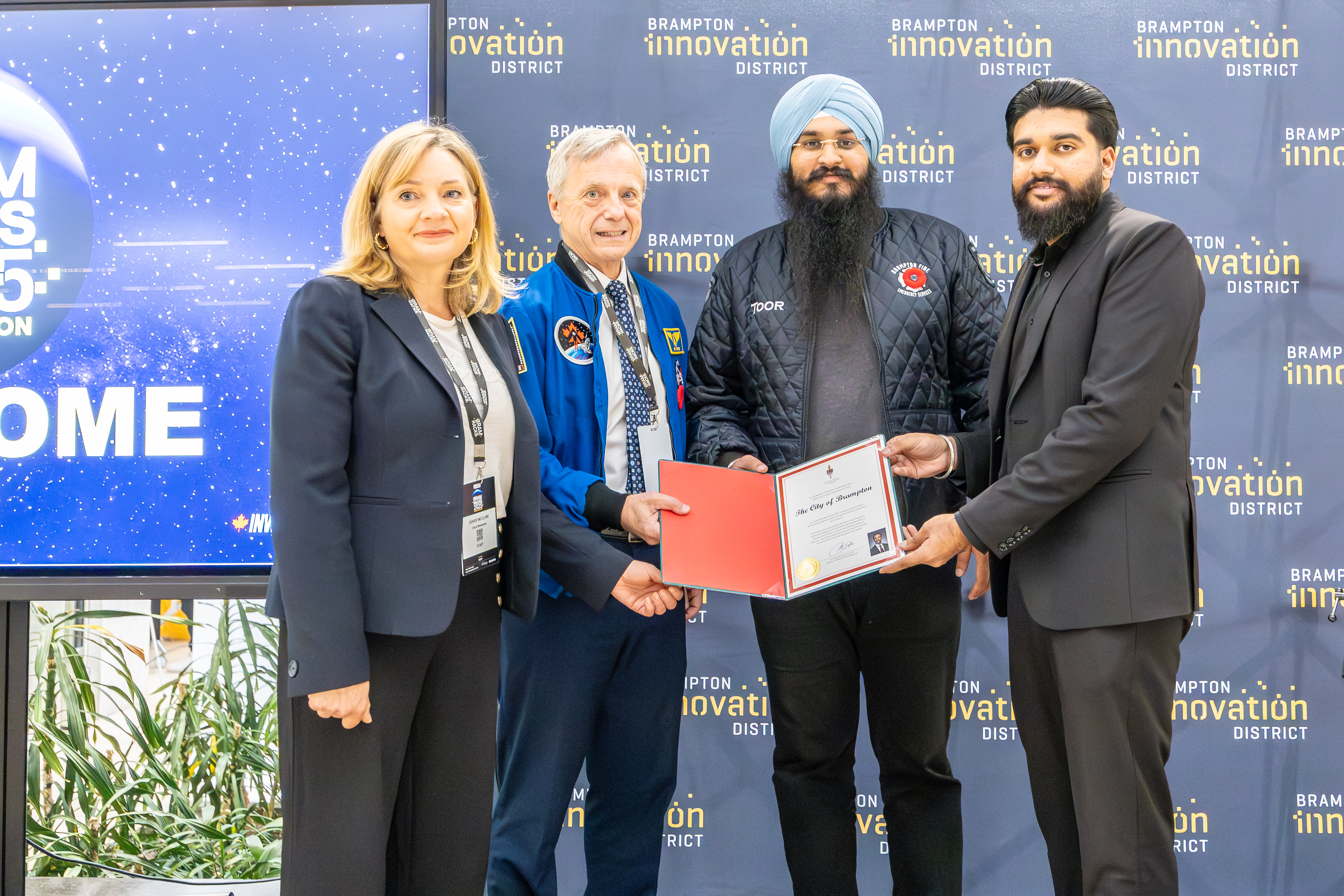 Denise McClure, Director, Economic Development & International Relations, City of Brampton; former Canadian Space Agency astronaut Dr. Robert Thirsk; Regional Councillor Gurpartap Singh Toor and Chair, Economic Development; and a representative from Minister Maninder Sidhu’s Office, following the presentation of a Certificate of Recognition to the City of Brampton’s Economic Development Office for leading and organizing BramHacks 2025.Credit: City of Brampton