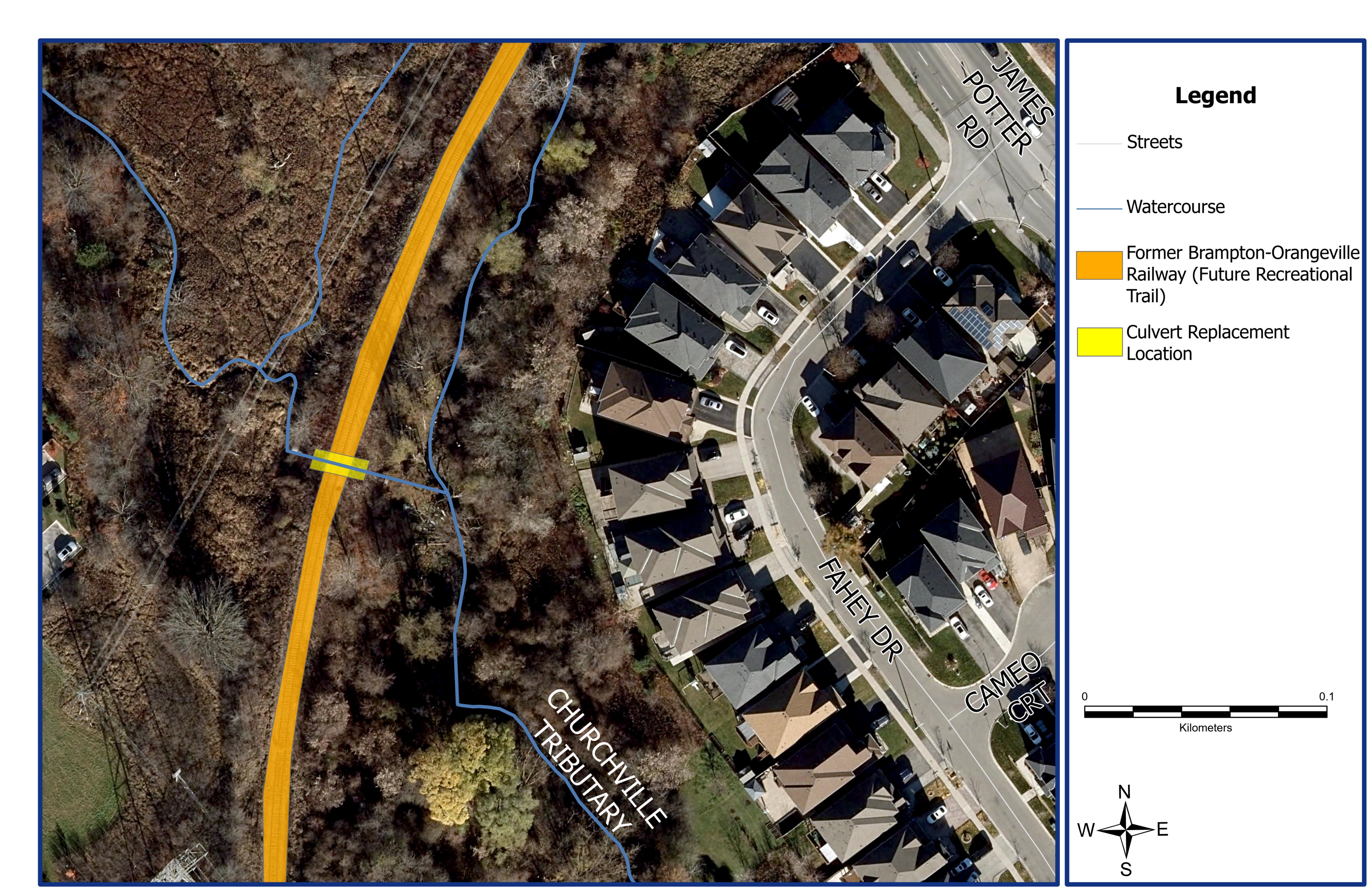 The City of Brampton is advancing the Brampton-Orangeville Rail Trail (BORT) project, which will transform a former rail corridor into a multi-use recreational trail. As part of this initiative, the City will replace the existing culvert crossing over the Churchville Tributary, near Fahey Drive and James Potter Road.