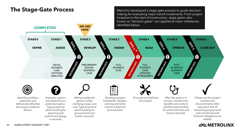 Metrolinx uses a stage-gate process to guide decision-making for major transit investments. From project inception to the start of construction, and commissioning, stage gates - also known as “decision gates” - are applied.